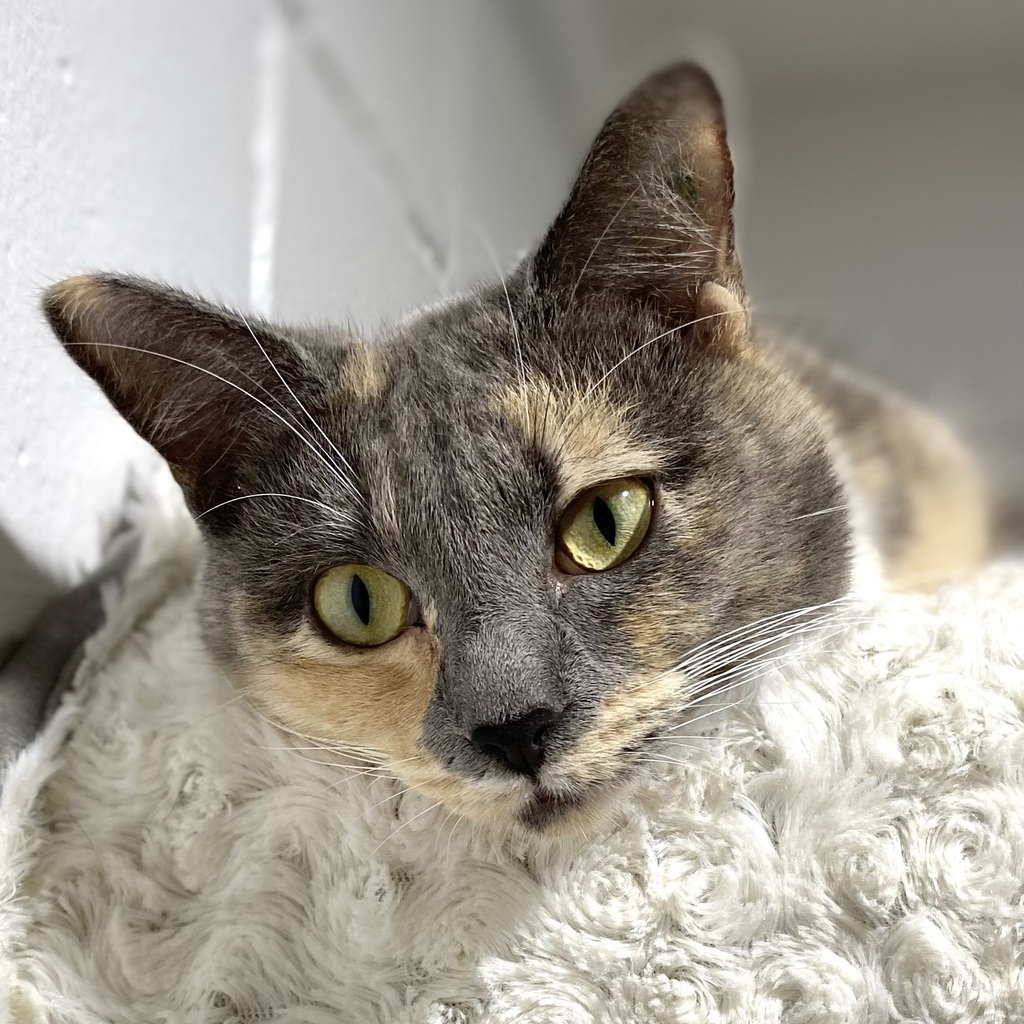 Aurora is an 11 month old, Blue cream tortoiseshell (a beautiful mix of blue-gray and cream patches). She is a sweet and affectionate cat who loves to cuddle and be petted. She's gentle, curious, and enjoys exploring her surroundings. Aurora would prefer to not have a cat friend in her home, however dogs are untested and would need supervised gentle interactions. Aurora is a calm and relaxed cat who appreciates quiet moments and cozy naps.