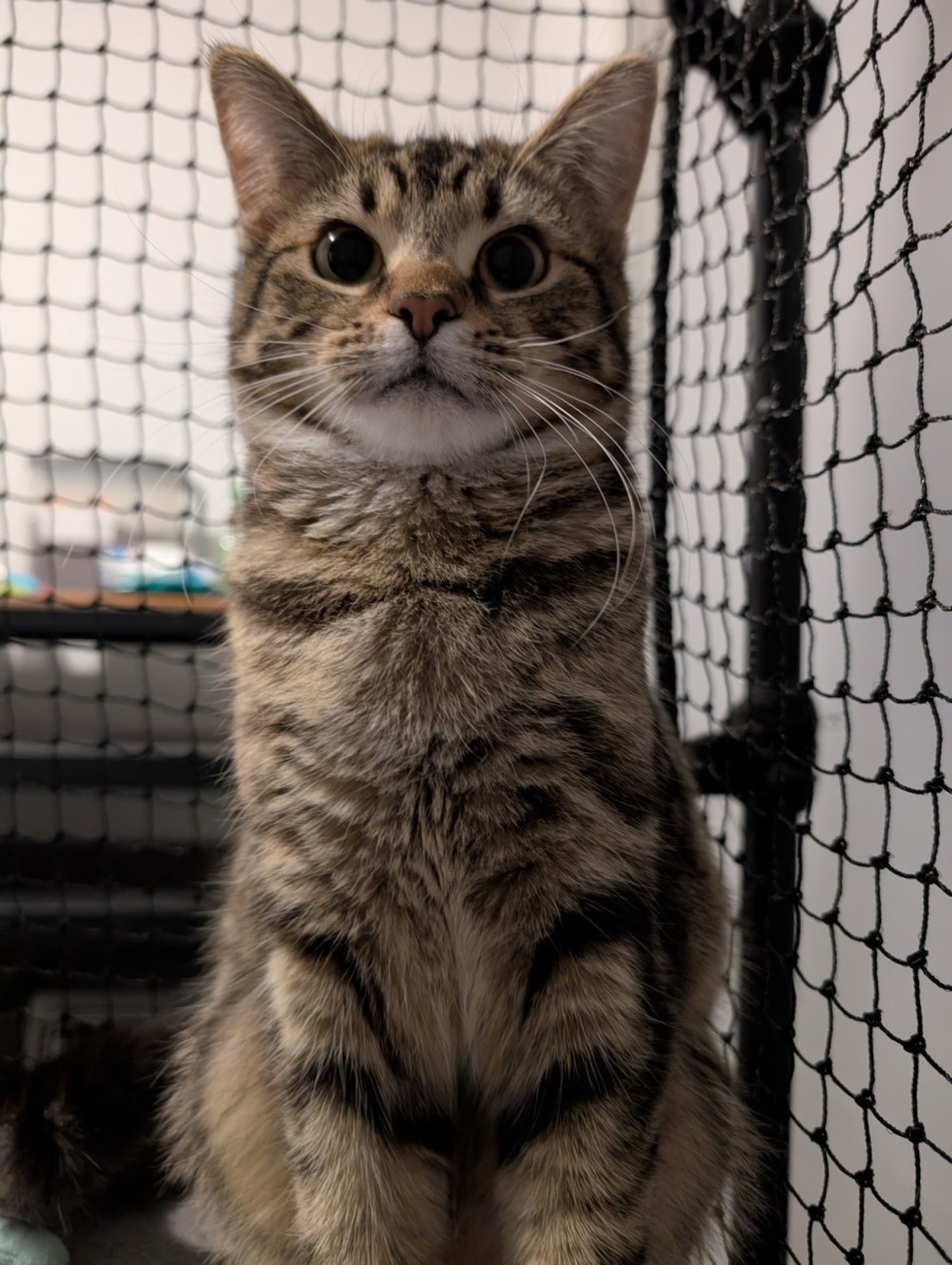 Originally incredibly skittish and hissy, she now purrs and purrs and loves to headbutt into your hand for pets, and meows for attention when she can hear your voice!