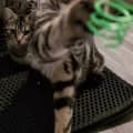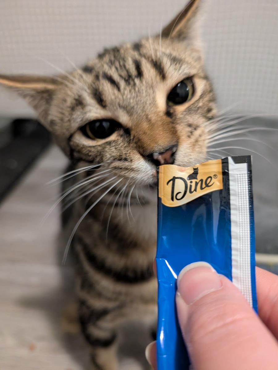 He is still quite skittish of hands and will run away when trying to be pet, however does love a good scratch when he's distracted with food, and has been quite cuddly and purry when he is comfortable!