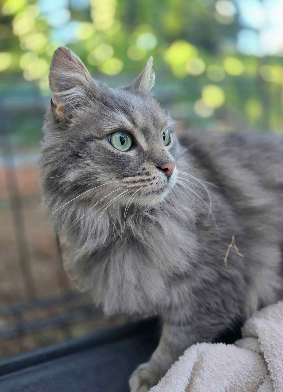 Meet Samuel Whiskers, an elegantly regal gentleman cat with alluring green eyes and a luxurious coat of lovely grey long hair. This charming pusscat is eager to grace your home with his refined presence and gentle purring melodies. Samuel Whiskers is a dignified fellow, and he possesses the kind of gentle charisma that makes him a cherished companion.