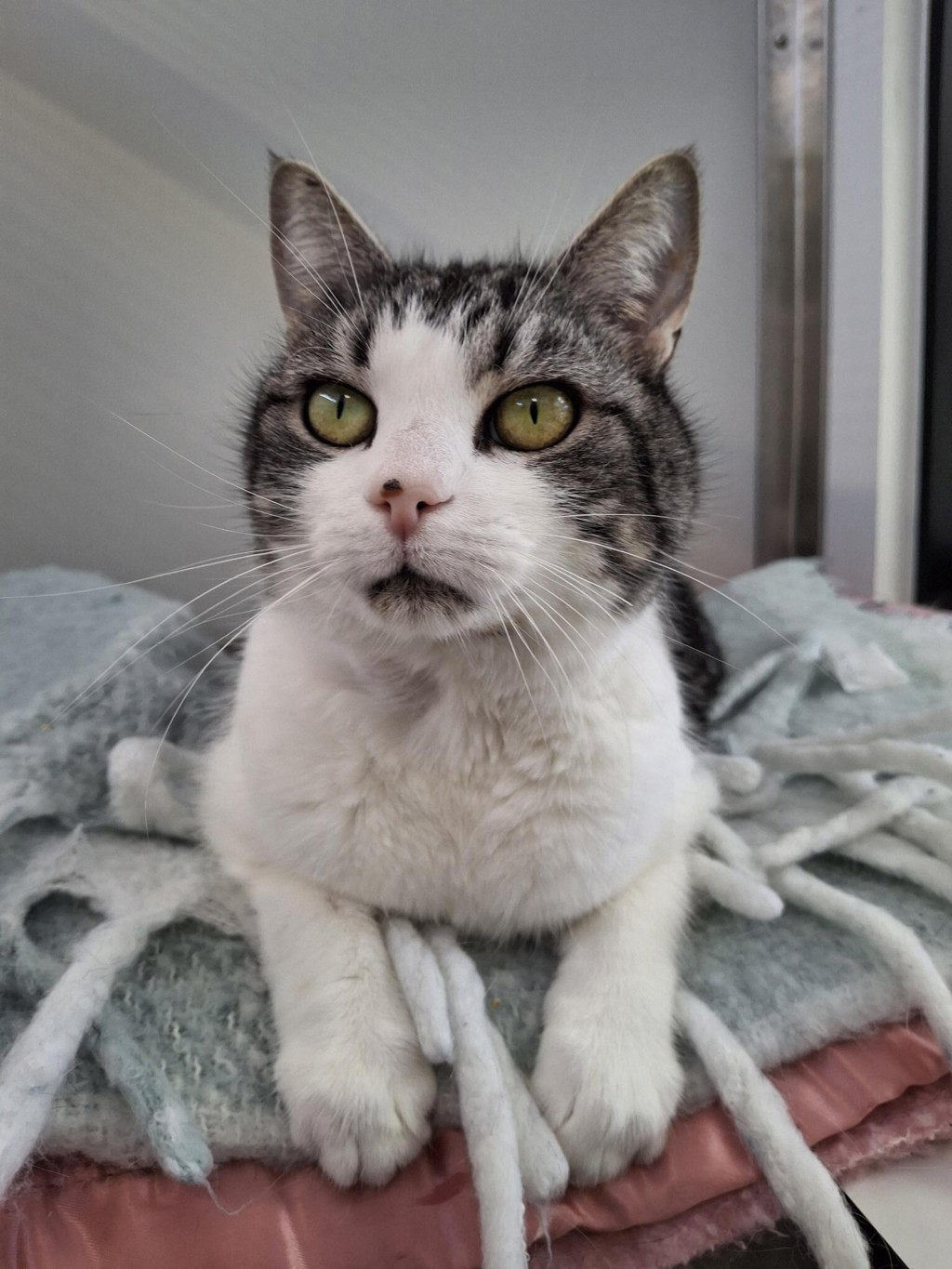 She enjoys the occasional playful moment-especially with a feather wand or a soft toy-but what she really loves is curling up next to her people for long, cozy naps. Mittens thrives in a calm home where she can feel safe, loved, and totally at ease.