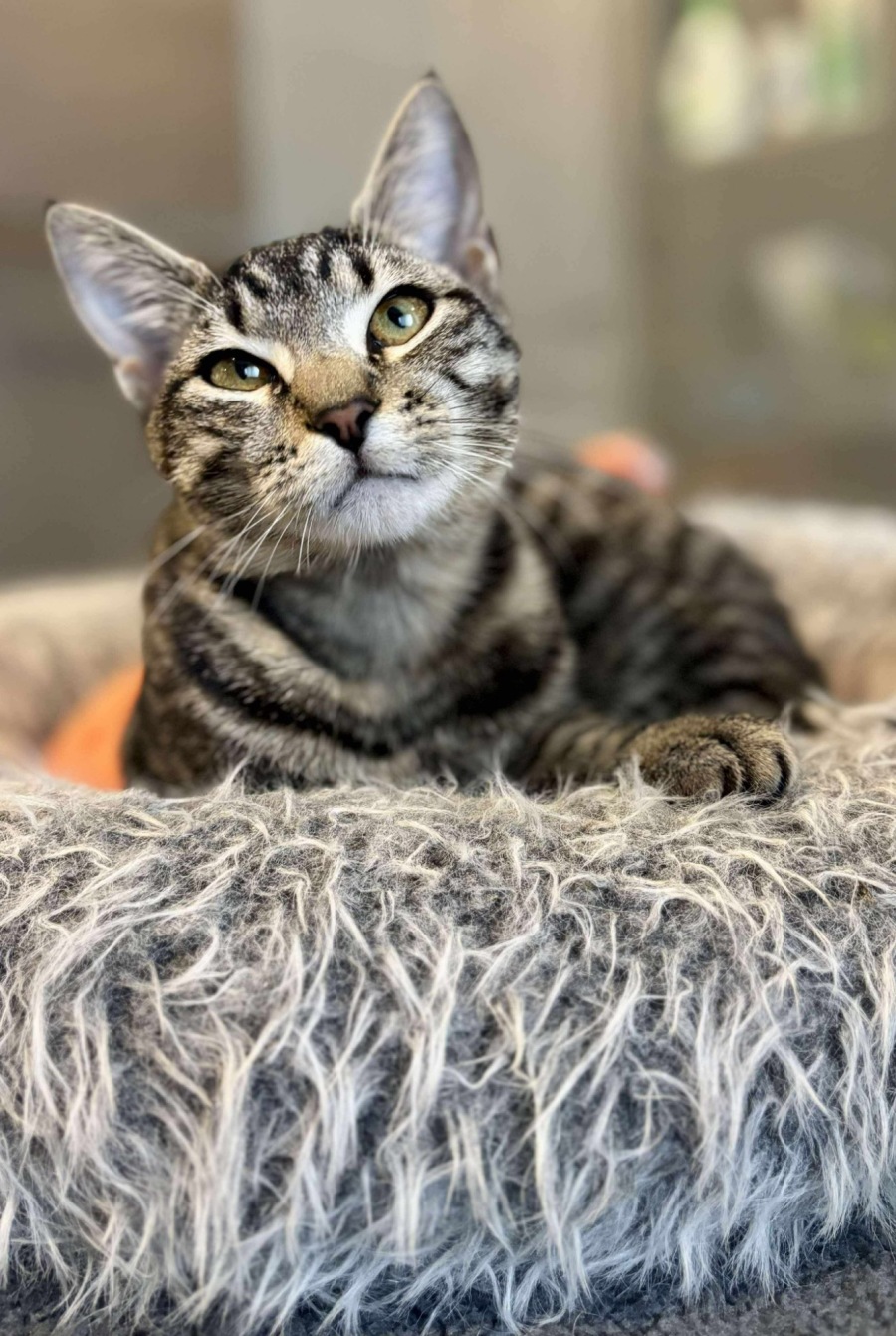 With her striking tabby coat and gorgeous eyes, Chloe is just as stunning on the outside as she is on the inside. She adores the company of other cats and loves to play, so a home with a friendly feline companion would be ideal.