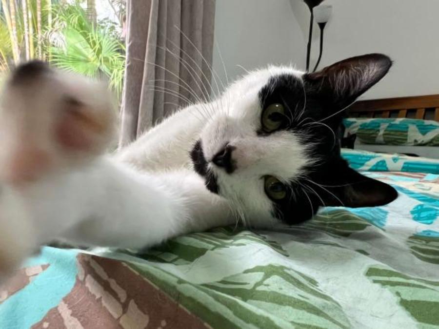 Oreo is a striking black-and-white boy with expressive eyes, a bold patch over his mouth like a little moustache, and a long, solid frame that houses a heart of pure gold. While he may need a moment to feel safe, he quickly becomes a purring machine—leaning into pats, rubbing his body against your legs, and nestling beside you as you wind down for the evening.