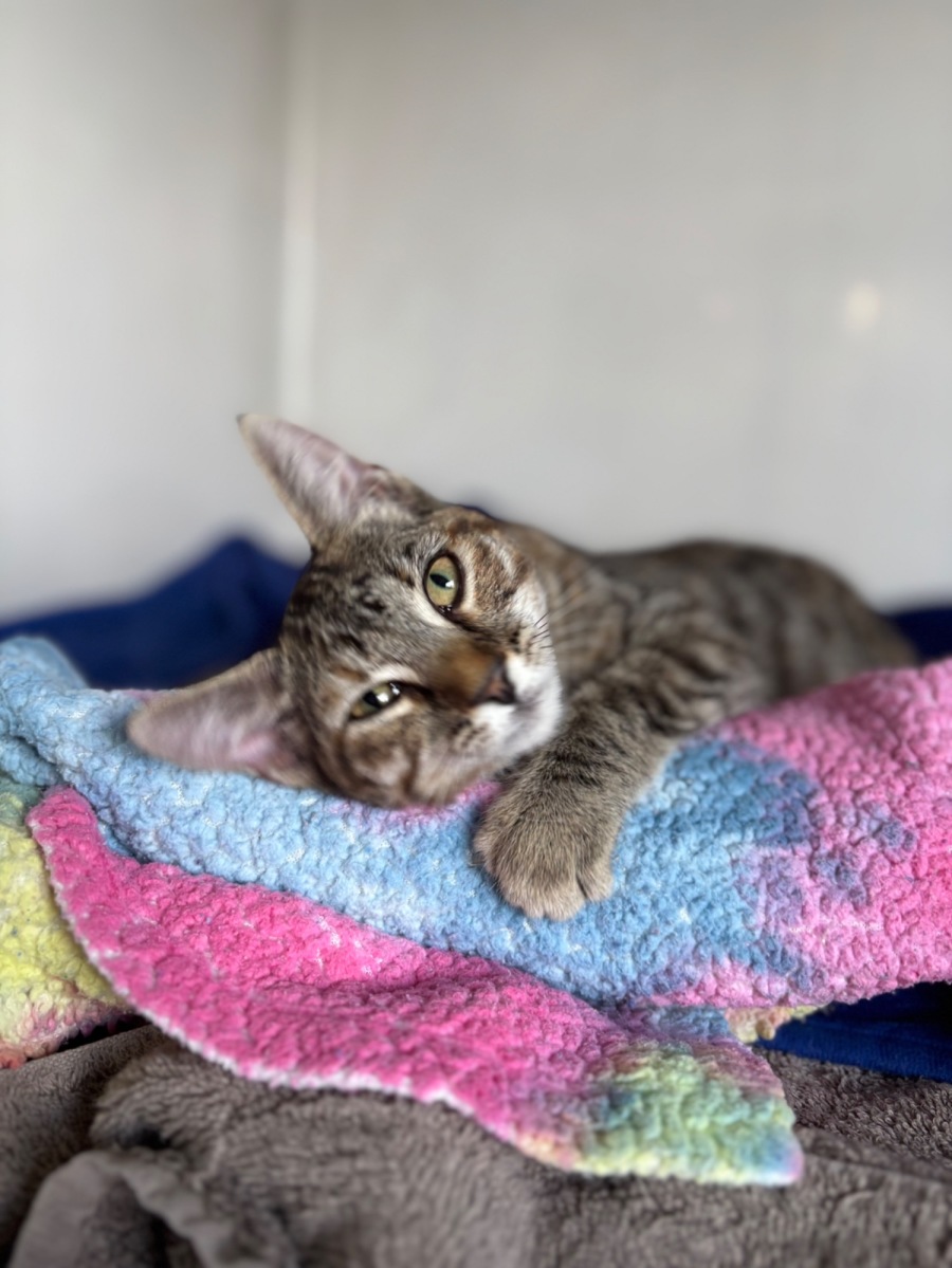 Introducing Nigella, an affectionate 4-month-old female tabby. This domestic short hair kitten is a quintessential "Velcro cat," always ready to be close to her people and shower them with affection. Her friendly and confident demeanor will immediately melt your heart, and her knack for making everyone around her feel loved makes her the ideal companion.