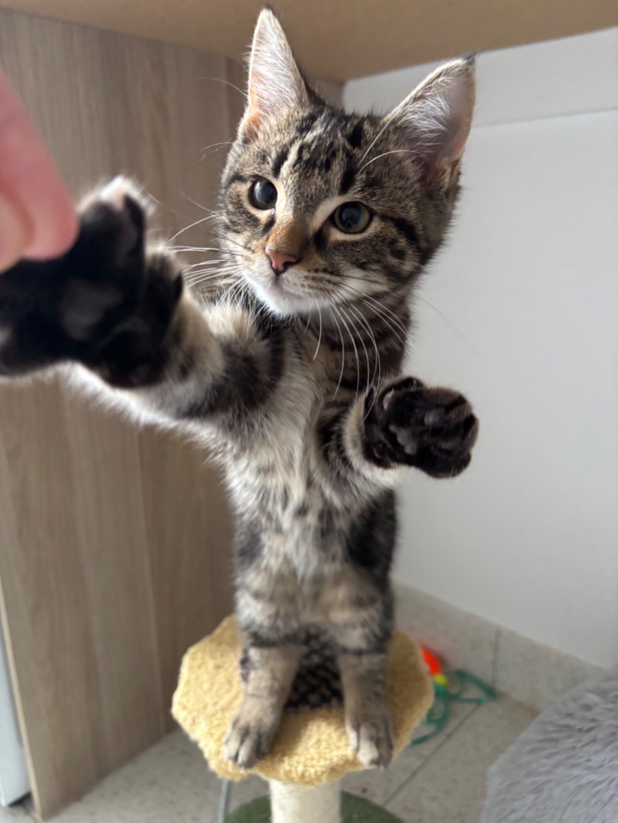 Allow me to introduce Channing, a charming tabby cat with the most captivating black markings.