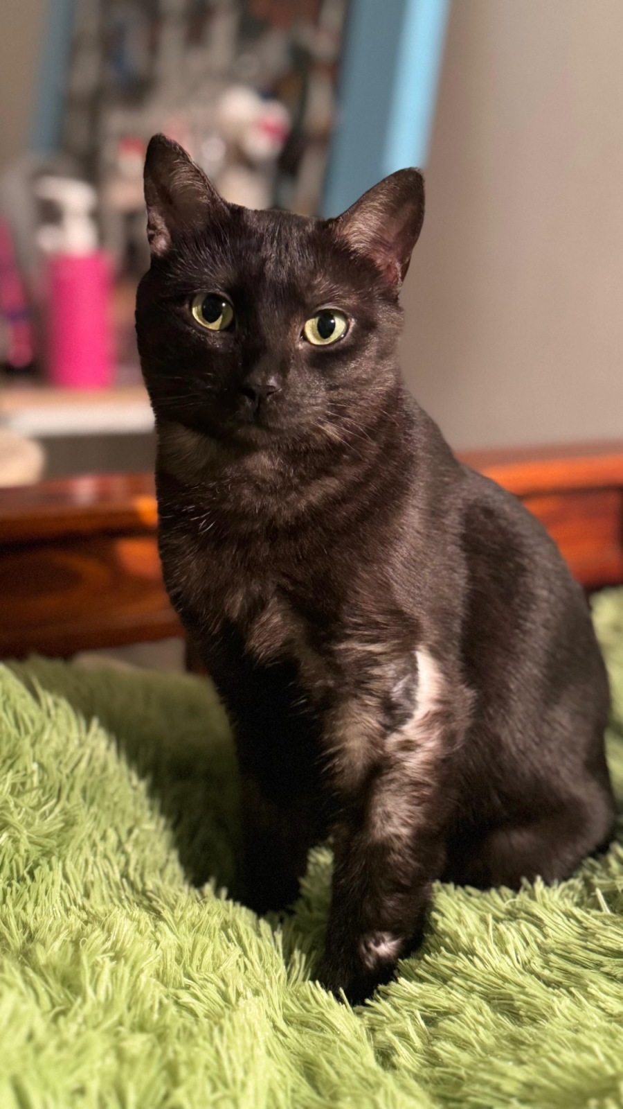 She adores cuddles, is highly food motivated, and thrives in a calm environment where she can snuggle up in peace. Her soft black coat is just begging for gentle pats, and her expressive eyes will make you feel like sheâs peering into your soul (probably to see if youâre holding treats).