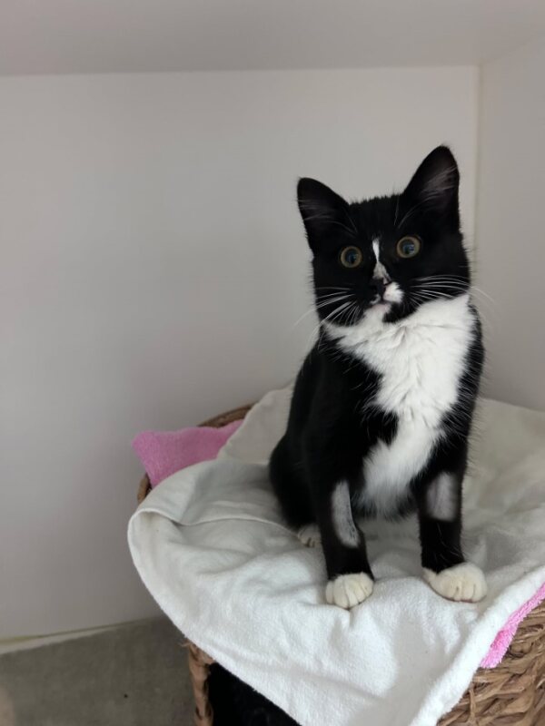 My name is Ariadne. I’m a 3-month-old black and white DSH kitten with a curious heart and a gentle soul. Life’s been a little hard so far, so I can be shy and timid, and I take comfort in quiet, gentle surroundings. I enjoy passive interactions—just being near you while I explore or relax in a safe, cozy spot is perfect for me.