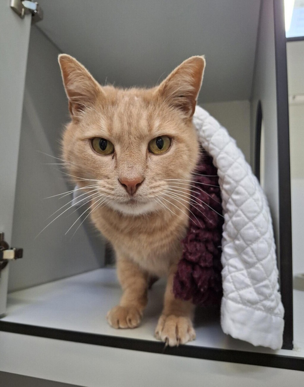 He can be a bit shy at first and likes to tuck himself away in cozy spots (blankets are his favorite!), but with patience and kindness, he opens up into a loving, affectionate companion who adores head rubs and scratches.