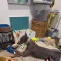 Hodgie currently resides in a spacious duplex where he enjoys daily indoor time. A large backyard isn't necessary for him, as he's content munching on treats and nesting on a comfortable bed for hours, deep in thought or napping. Though he gets along brilliantly with the two greyhounds he shares his home with, he equally cherishes the company of humans, diligently shadowing you as you go about your day. Despite his size, he's far from cumbersome—Hodgie is a quiet, collected soul who finds joy in the simple pleasure of resting in the sunshine, keeping a watchful eye on the birds.