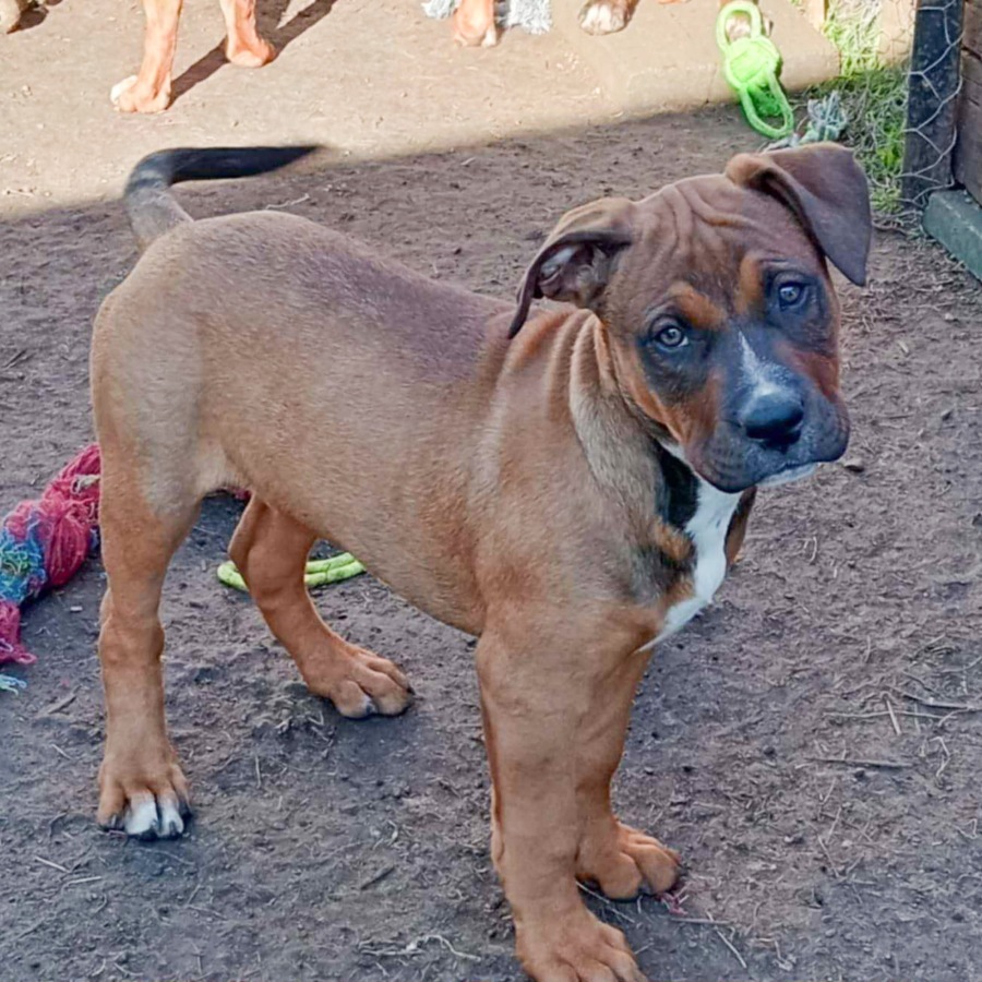 Crispin's Mum is an English Staffy x Amstaff and his Dad is a Mastiff mix, a hybrid known as a "Staffy Mastiff". We expect Crispin to be 35+ kgs at maturity.