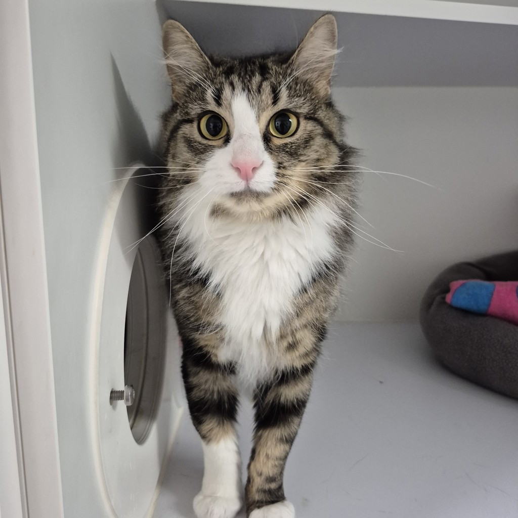 She enjoys quiet company, soft voices, and slow, reassuring pets. She doesn't demand attention, but you'll often find her watching you from a cozy spot, hoping you'll come sit with her.