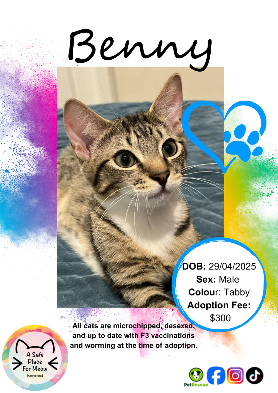 Say hello to Benny, your future feline companion who embodies the perfect blend of playfulness and affection. This little guy is always on the hunt for new adventures, using his wily sense of curiosity to explore every nook and cranny of his surroundings. When you call his name, expect Benny to come running. He's not just a cat, he's a little shadow who tails you around the house, ensuring every moment is filled with fun and companionship.