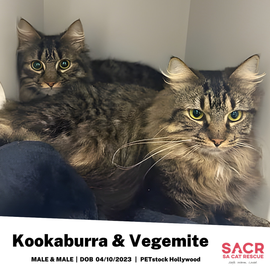 Meet Kookaburra and Vegemite – a bonded pair of big, fluffy tabby brothers who bring double the love, double the purrs, and double the charm. Much like their namesakes, they’re full of Aussie spirit – Kookaburra’s got a cheeky twinkle in his eye, and Vegemite is all about that rich, comforting presence.