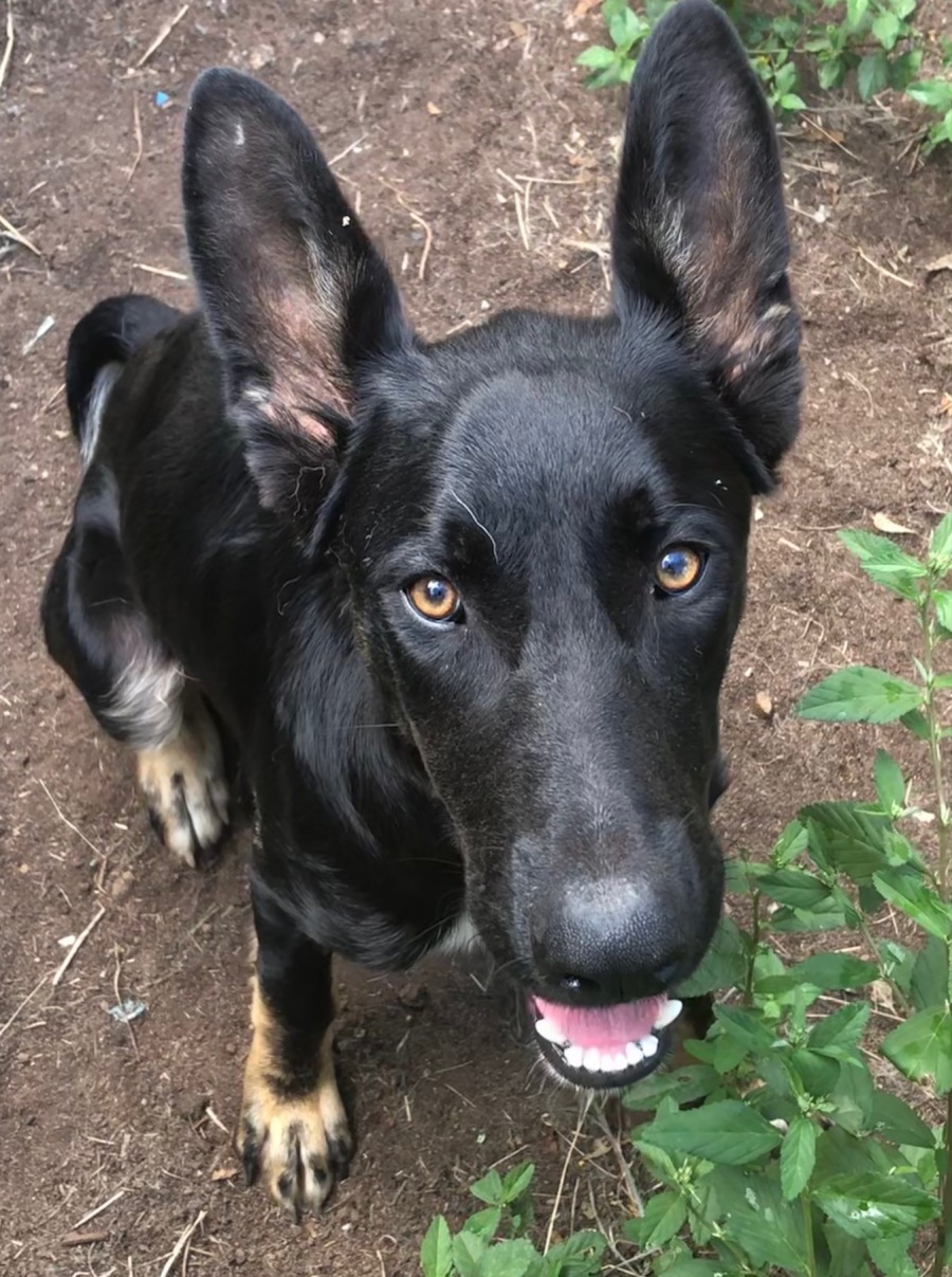 He seems comfortable with other dogs and is curious and confident with people and doing well with basic training.