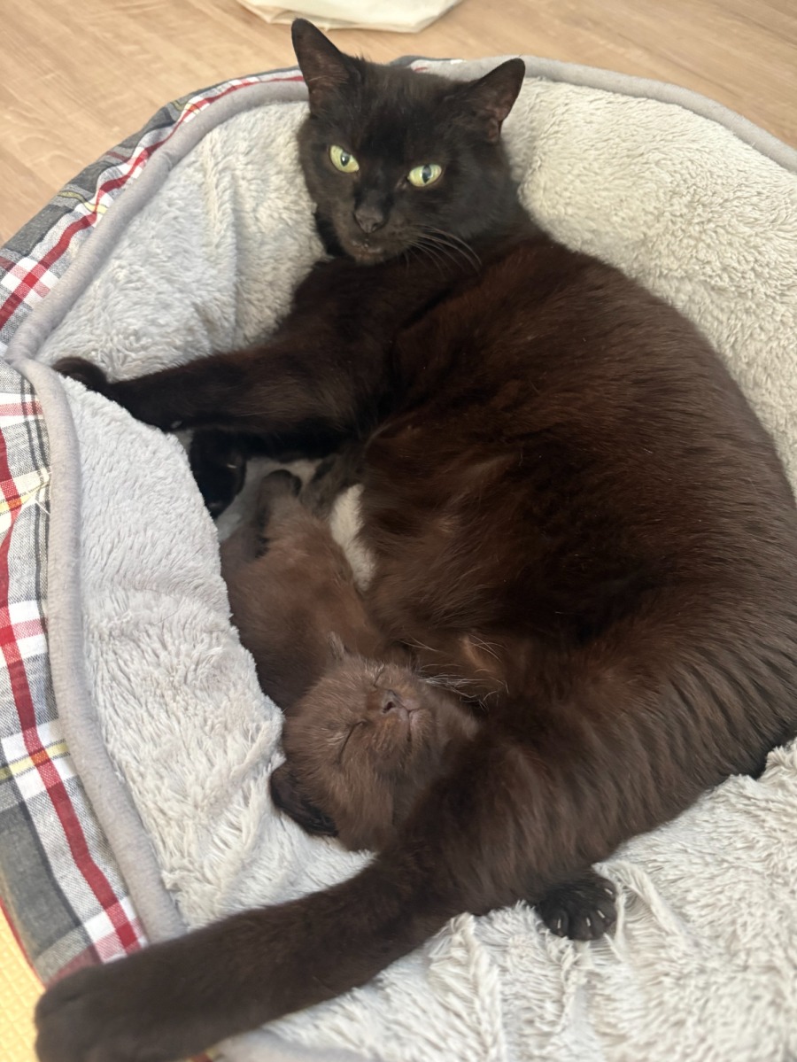 They’ve been thriving in foster care, living in a busy household with kids and other cats. Mystique has blossomed into a confident, affectionate girl, and Panda has grown into a playful, adventurous ball of energy who keeps his mum on her toes!