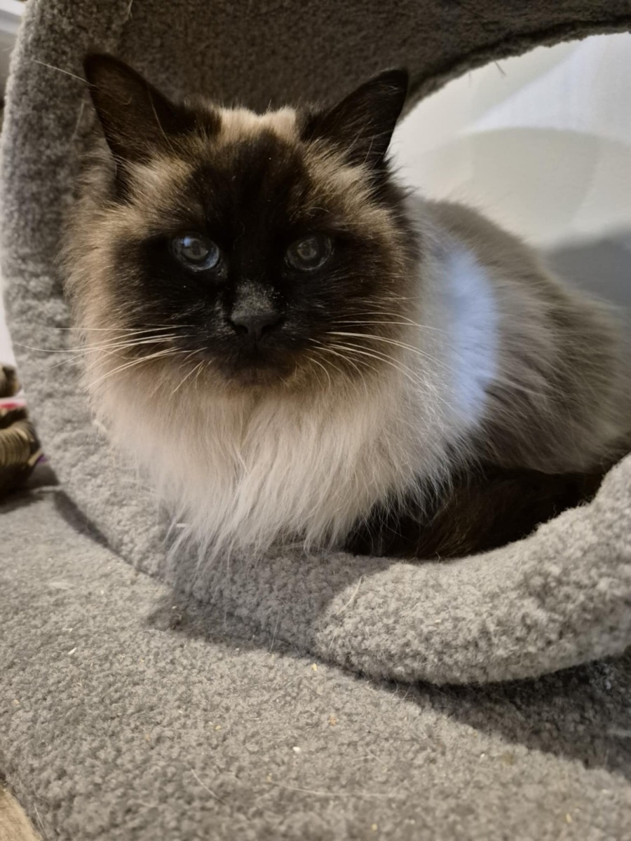 Meet Fifi, the lovely Seal Point Ragdoll who embodies grace and elegance with her dazzling blue eyes and soft, plush coat. At the charming age of 12, Fifi is seeking a new family to grace with her gentle, soothing presence. While she's had a few dental adventures over the years, her little gummy smile only adds to her charm, giving her an endearing and unique personality. With her healthcare updated and no need for future dental expenses, she's ready to enjoy a life of comfort and joy.