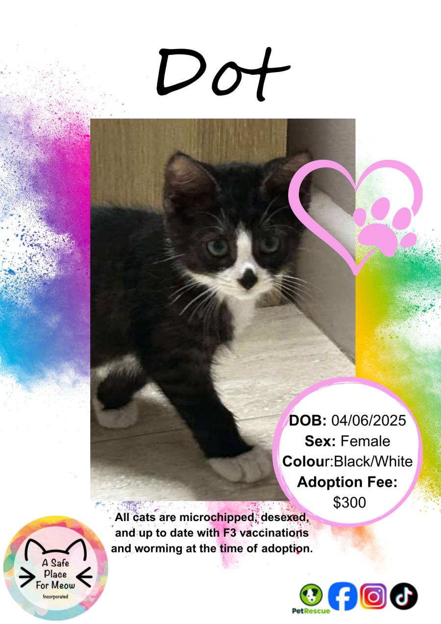 Meet Dot, a quiet little girl with a heart full of potential and promise. This gentle feline is eager to share her affection with a loving family, offering a devotion and care that are truly warming. Dot may be shy at first, but with some kindness and consistency, she blooms into a devoted companion who will surely steal your heart.