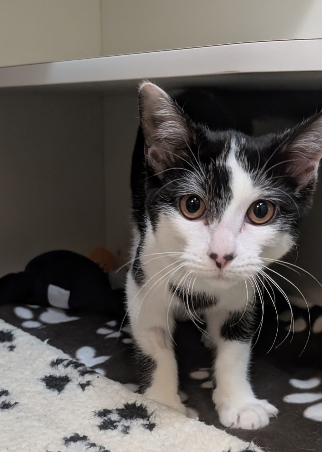 Hi, my name is Tuxedo Sam. I'm a sweet, shy kitten, but I don't take long to come out of my shell. I am looking for a patient home that will love me forever. If you think that I'm the one for you, then please come to the RSPCA in Malaga to meet me today!