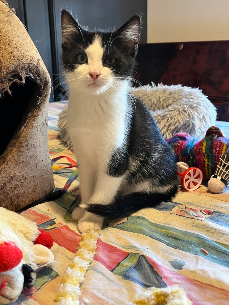 Tommy is still just a kitten, which means he’s full of energy, curiosity, and all the classic “kitten antics” you can expect – zoomies, wrestling matches, and a fascination with just about everything. He also has a big love for food, which makes him easy to bribe when needed!