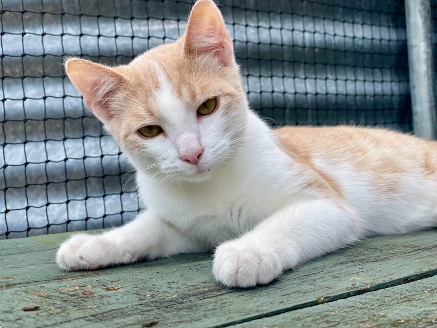 Dewey is a Domestic Shorthaired cat. He has gorgeous white socks, white chest and belly which contrasts against his light orange tabby stripes.