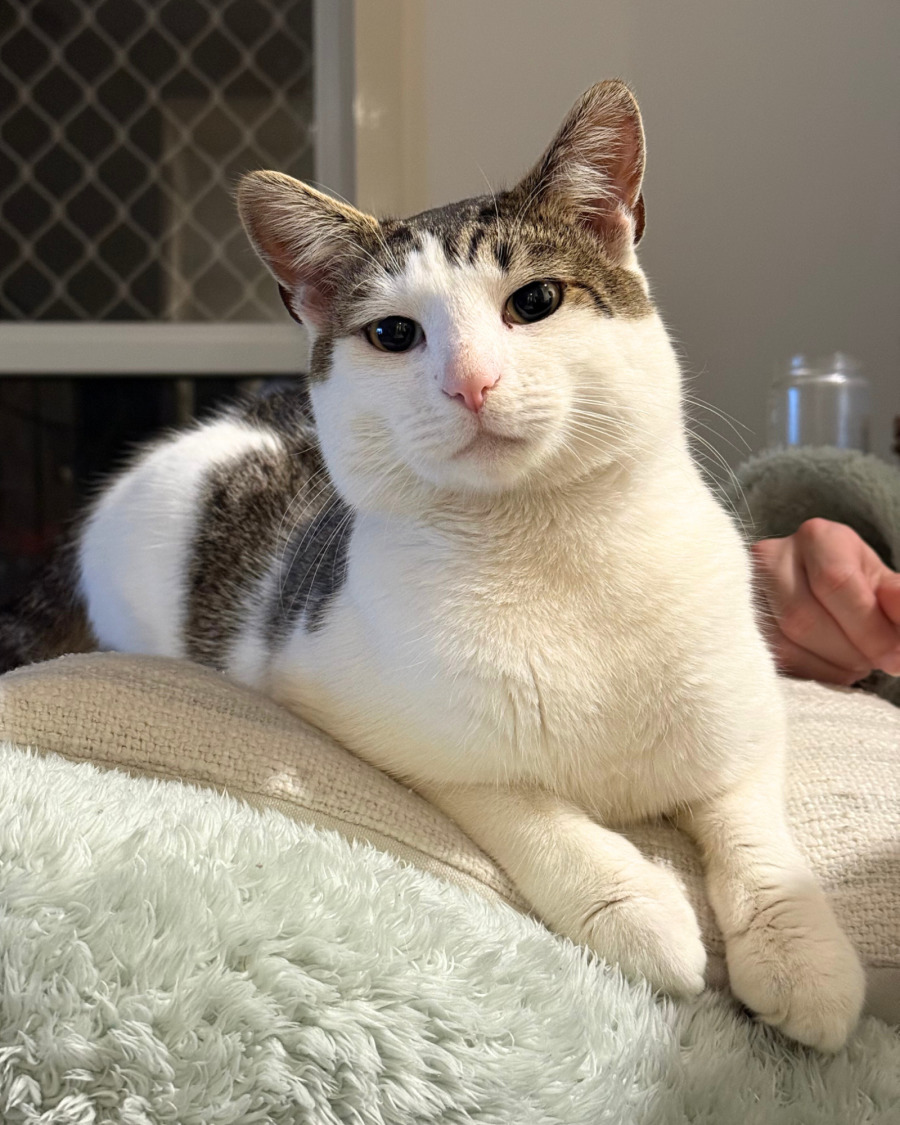 He is an adorable male cat with a confident and curious personality. He is very food motivated and loves being the centre of attention.