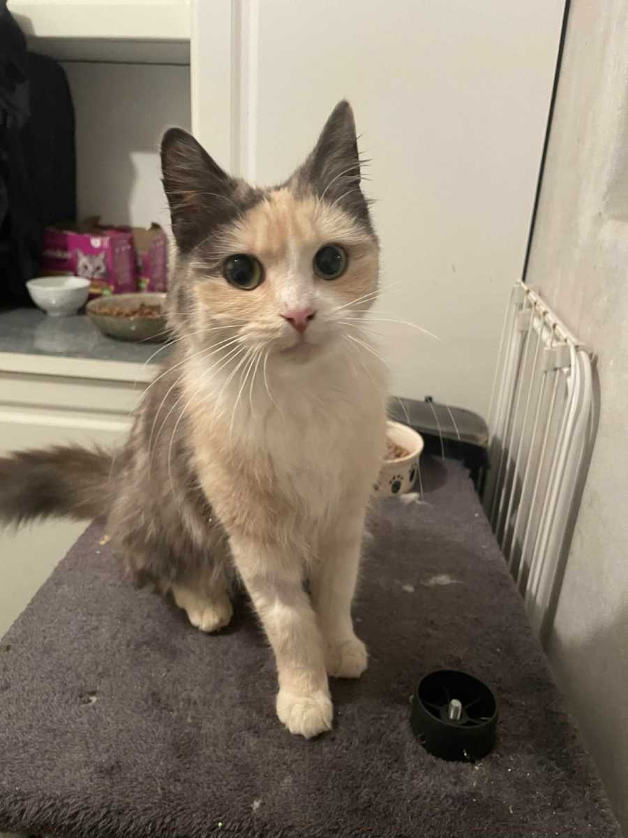Ready to add a little sparkle to your life? Meet Mochi, a beautiful 1.5-year-old medium-haired blue calico. This adorable ball of fluff was rescued from the streets, where she'd come alive each night, racing up tree stumps and playfully pouncing on other cats. Now, she brings that same vibrant energy and enthusiasm to her indoor life. Mochi is super friendly and affectionate, loving her human companions almost as much as she loves playing with her treats. We think you'll love her very mochi!