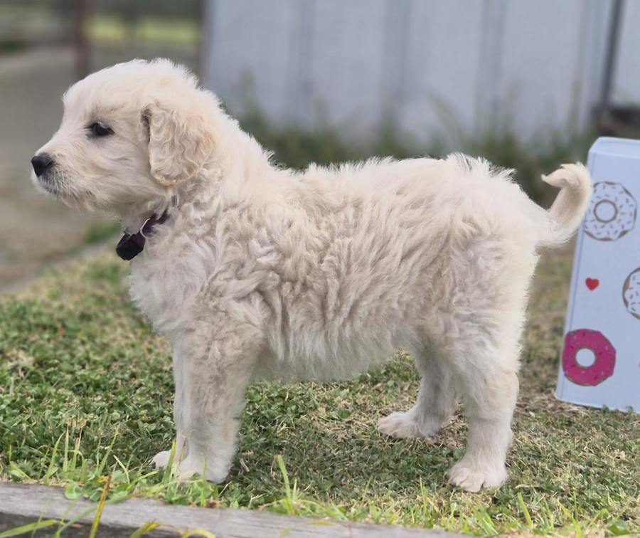 Piggy’s mum, Penny, is a Maremma and although her dad is unknown, all the pups have magnificent wavy or curly white or gold cream coats, suggesting that dad could be a Golden Retriever or similar.