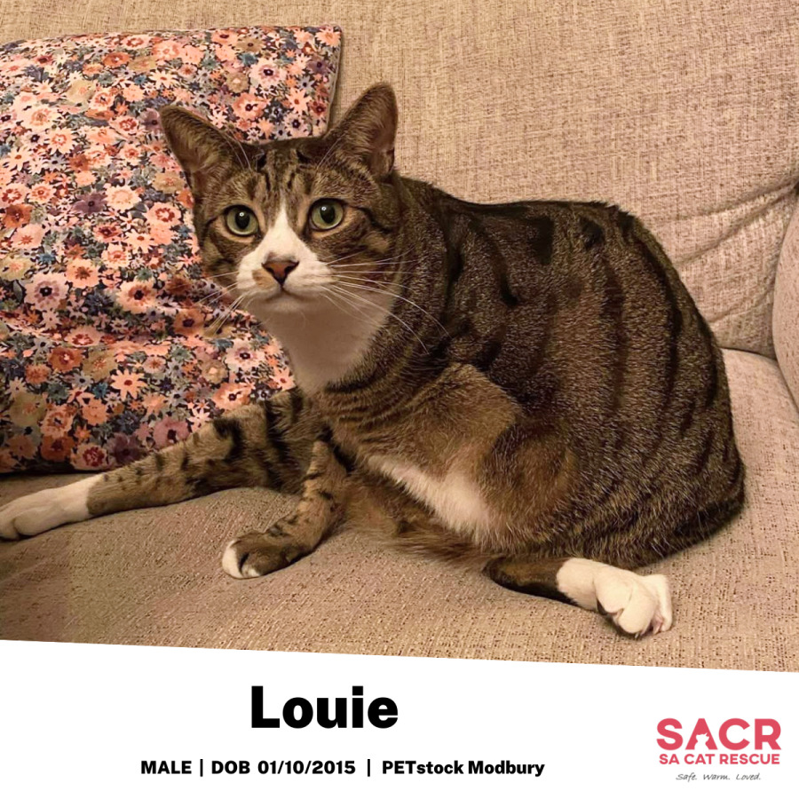 Louie would be happiest in a stable, loving, lifelong home where he can enjoy the simple pleasures – good food, cosy spots to nap, and, of course, regular butt pats. He’s cautious around other cats, unsure with dogs, and hasn’t yet been tested with children, but with the right introductions and a calm environment, he’ll shine.