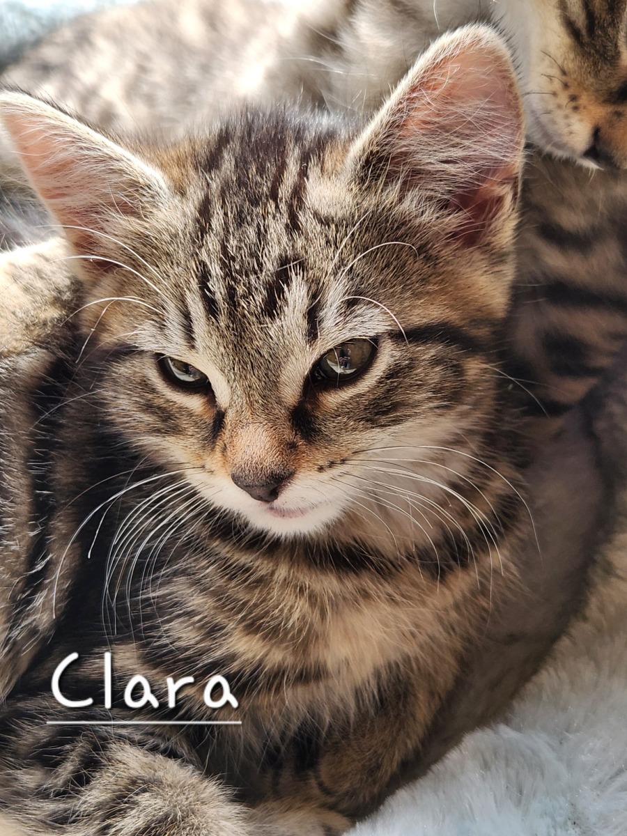 Clara must be adopted with one of her siblings or into a home with an existing cat.