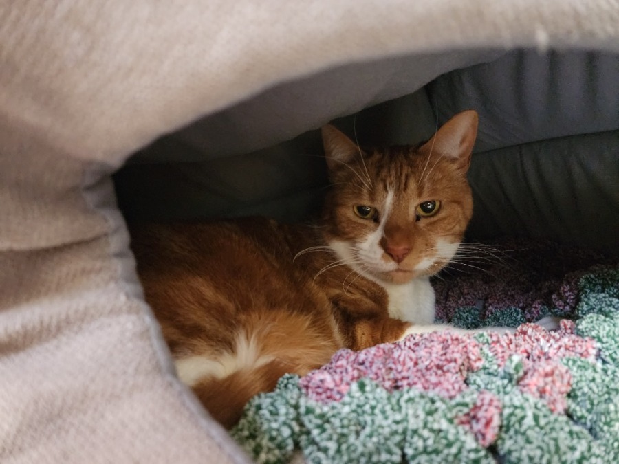 Boots is a six-year-old sweetheart with a soft spot for snuggly corners. This charming girl is incredibly affectionate and loves spending time with her humans, especially if you’re up for a good chat—she’s got a lot to say and isn’t shy about sharing her thoughts!