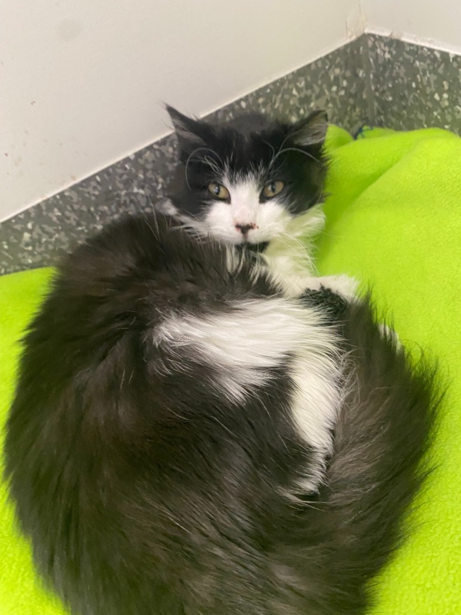 She’s okay with kids and could live with another cat, as long as introductions are done slowly and gently. Domino is still young and full of curiosity, so she’ll thrive in an indoor-only home where he can explore, play, and most importantly—be a well-loved member of the family.