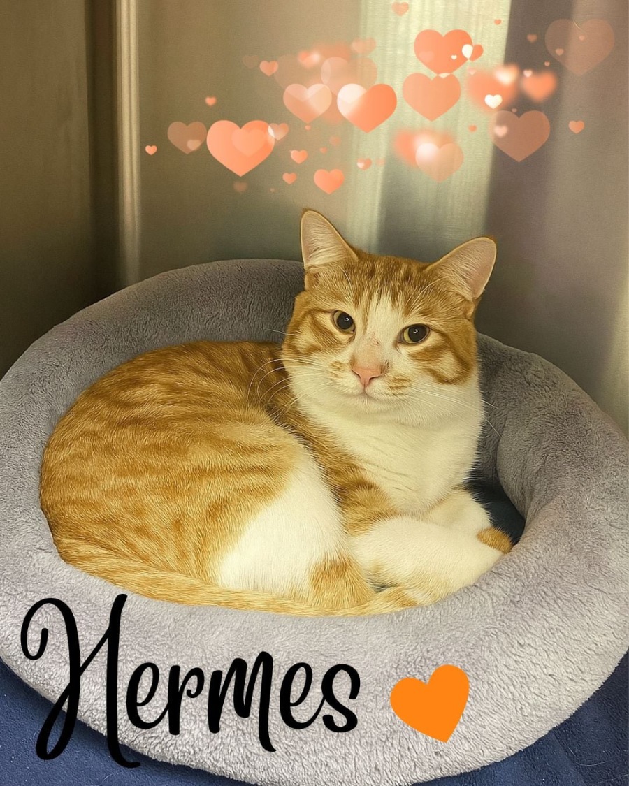 Looking for a cat who’s as stunning as he is snuggly? Say hello to Hermes – the sleek, sweet, and totally sensational orange-and-white heart-stealer on the hunt for his forever home. 💛