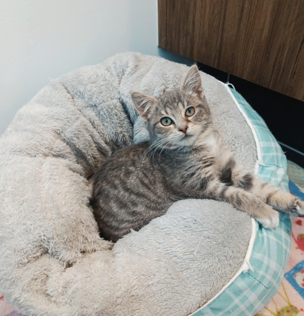 Flora is a sassy yet sweet girl who might take a little time to warm up, but once she's comfortable, she turns into a cuddly purr machine. She's full of energy, zooming up and down the stairs, chasing balls of paper, and always eager to try new things. Flora knows what she wants and will let you know with a little screechy meow if you interrupt her playtime. Once she's done, she'll come looking for you for a cuddle and a nap on your lap.