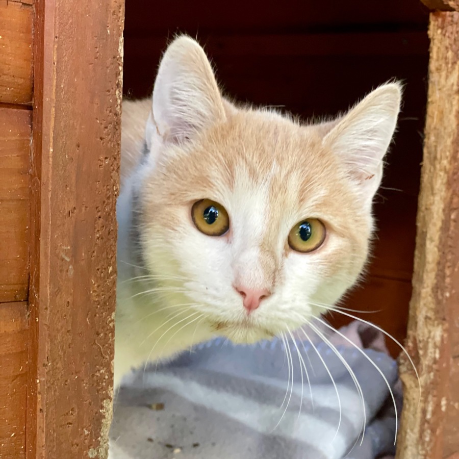 I am a domestic shorthaired cat. I have a white coat with ginger/cream spots. My brothers and I are the same but we have different coat patterns.