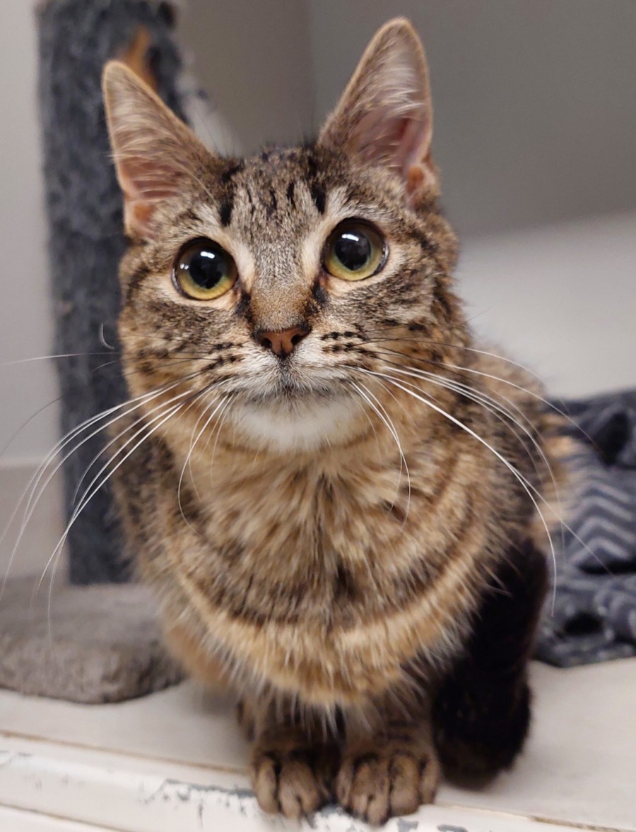 Cherish is a beautiful, silky-soft brown tabby with a warm heart. This affectionate older kitten loves human interaction and is happiest when being patted, cuddled, or simply being near you. soak up all the attention you’re willing to give. Her cheerful, easygoing nature makes her a joy to be around.