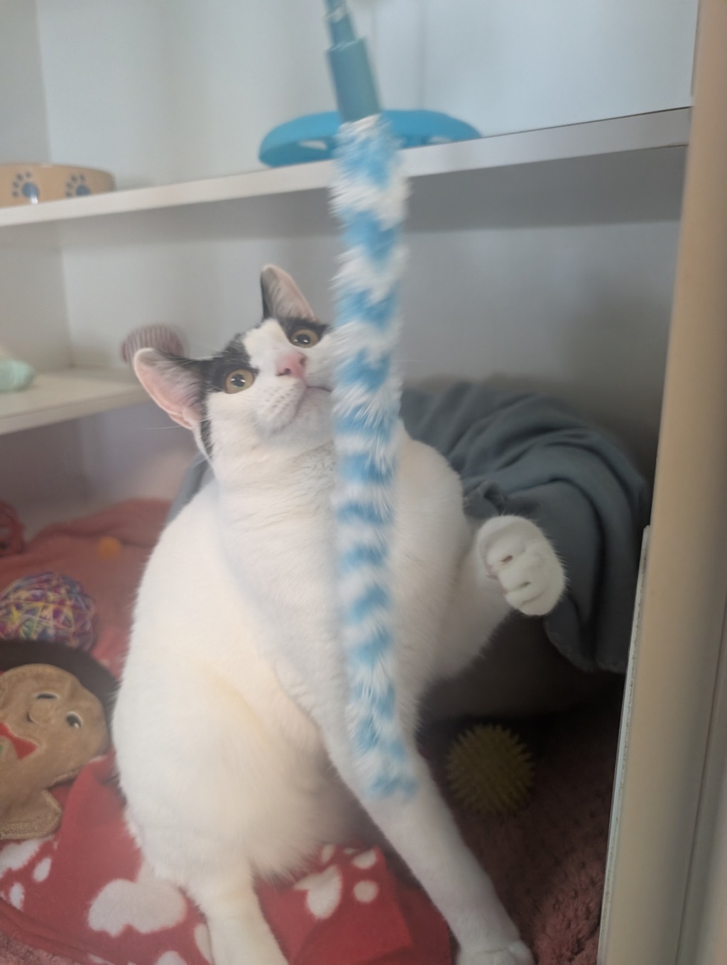 This adorable black and white boy is just under a year old and full of love. Muffin is a smoochy sweetheart who adores cuddles, kisses, and playtime. Whether he's chasing toys or curling up in your lap, he's always ready to share his affection. With his charming personality and gentle nature, Muffin is the perfect mix of fun and cuddly. Looking for a loyal little lovebug? Muffin's your guy!