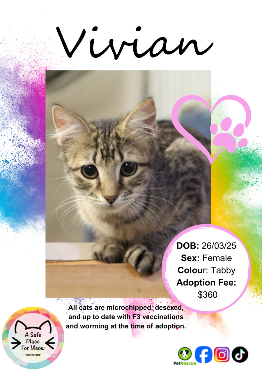 Despite her lively antics, Vivian has a soft side that craves love and attention. She will make sure you know when she wants some gentle pats and cozy cuddles, often communicating her desires with the cutest little meows. After an exciting day filled with fun, Vivian loves nothing more than curling up next to you, basking in the comfort of your presence.