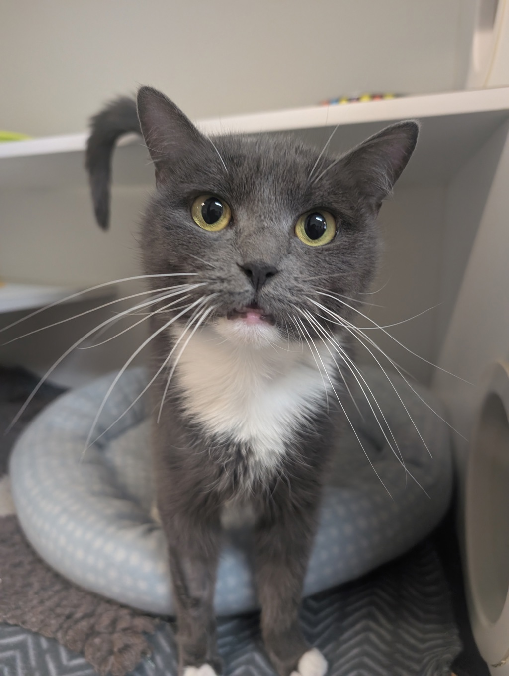 Sook is a graceful, grey female cat with a heart of gold-and a love for connection. Her favourite thing in the world? Curling up beside you and melting into peaceful purrs. She's incredibly affectionate, and you'll know you've made her day when she greets you with a gentle nuzzle and a serenade of rumbling purrs.