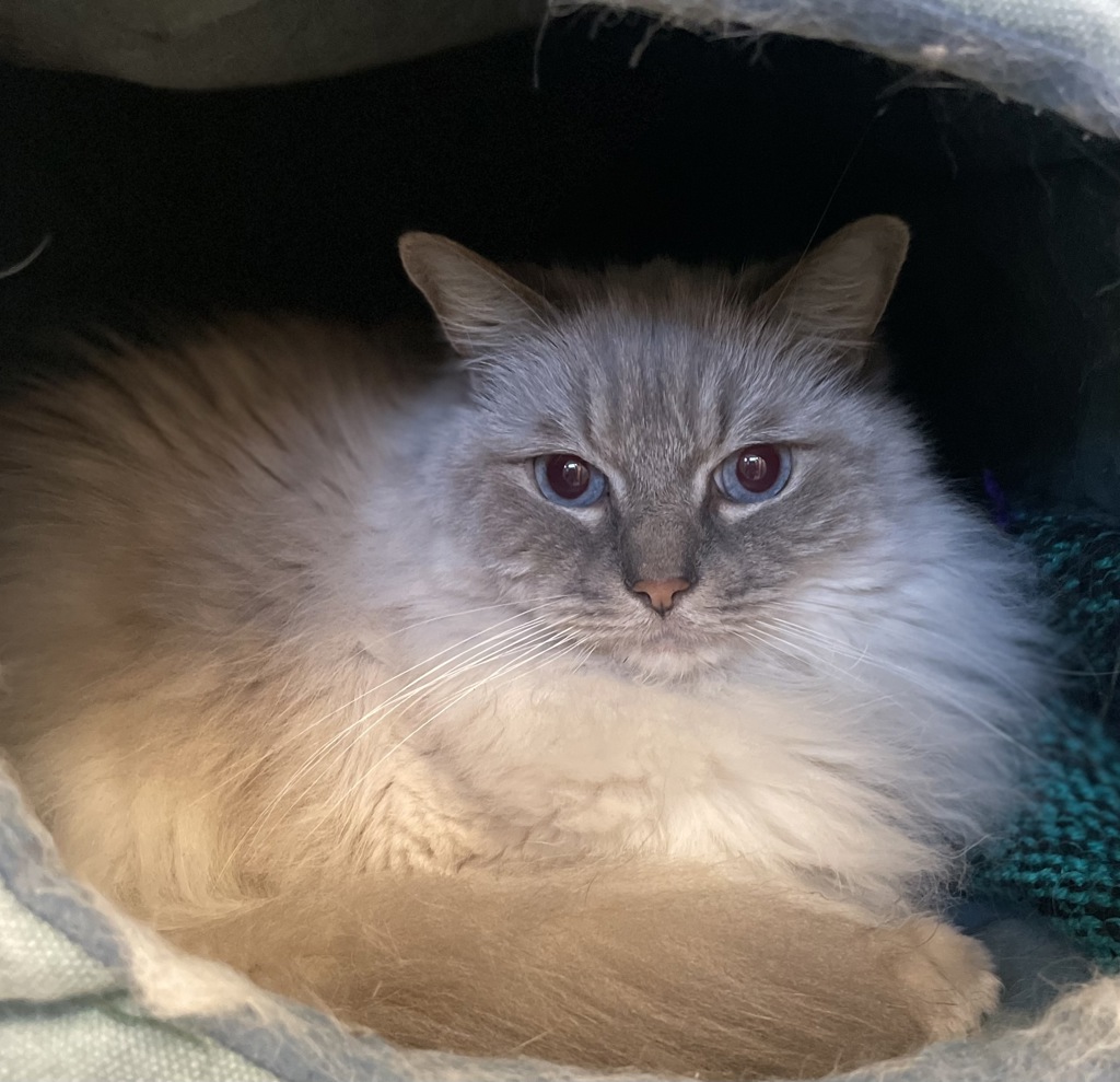 Sebastian is a 6-year-and-10-month-old Ragdoll cat with all the classic grace and gentleness of his breed. His plush, semi-long fur is soft as silk, colored in soothing tones of cream and soft grey, with striking blue eyes that seem to hold an endless well of calm affection.