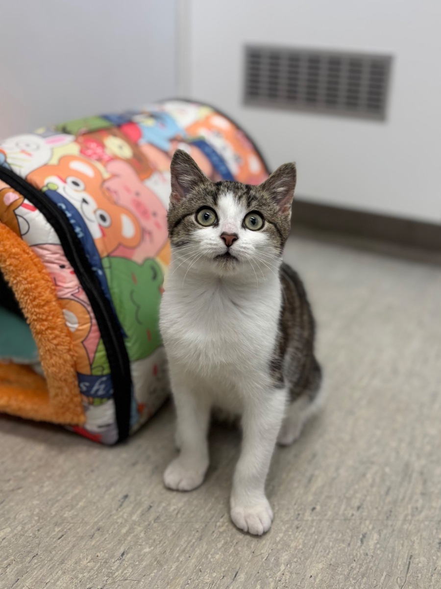 Meet Tucker, an 11-week-old male Tabby & White Domestic Short Hair kitten who's ready to bring a sprinkle of joy and cheekiness into your life. With his adorable markings and bright eyes, Tucker is the perfect blend of playful and sweet. His youthful curiosity makes him a bundle of energy, always ready to pounce on a toy or chase a feather.