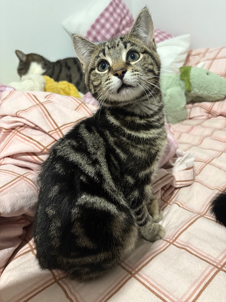 Hunter is a short-haired brown tabby with a strong square face that gives him a striking look. He’s all love and not much brains — a clumsy, amusing, and utterly huggable boy. He loves to sleep on your legs, knead your feet (whether it tickles you or not!), and play with absolutely anything he can get his paws on. Fake bugs and laser pointers are particular favourites.