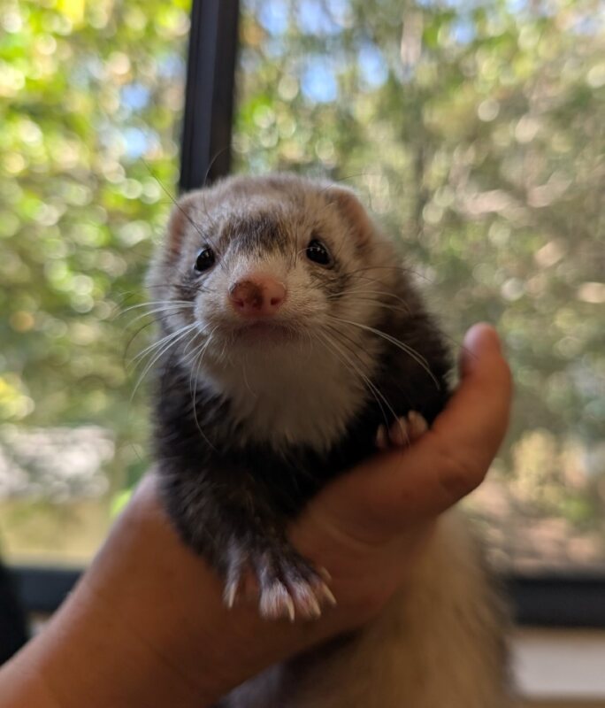 Hi there, my name is Emi. Playful, inquisitive, entertaining and social all describe me. I love my treats, playtime, boxes and hidey holes, exploring my home and just about everything! A home with ferret experience is best for everyone's comfort. Having been raised with my siblings, another ferret pal would be fun in my new home as well. If you are interested in adopting cute little me, visit the shelter, meet me and see if we are a match.