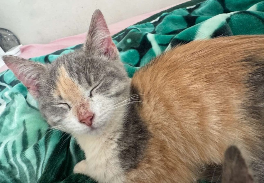 Luna and her siblings had ringworm when they first came to the rescue. They have been treated and the ringworm is all clear now, but you can see in the photos that the scabs are still healing on their noses and the fur needs to grow back there. Once the scabs are gone, Luna will be extra beautiful!