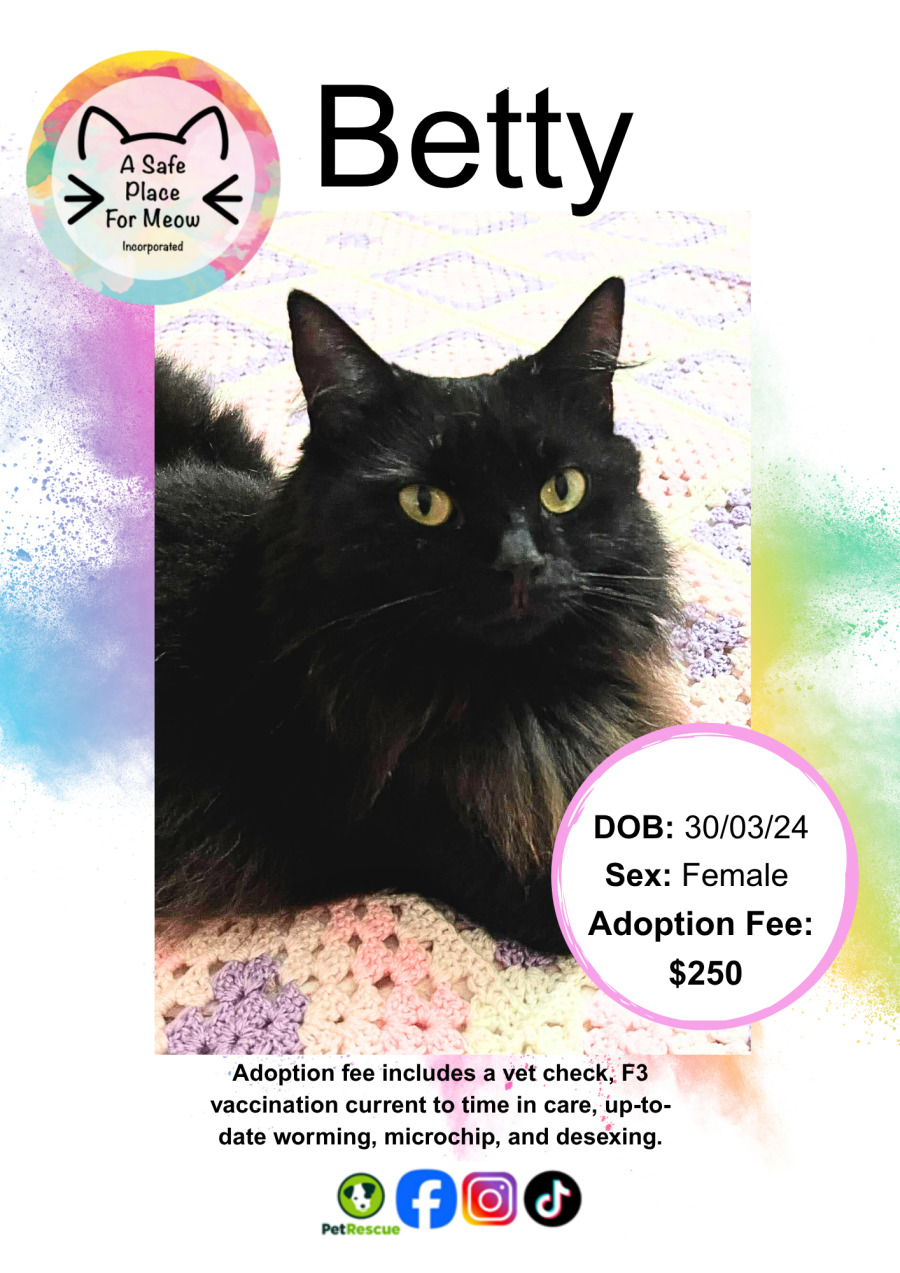 Betty, a little black fluffball with the kind of eyes that stop you in your tracks. She came into care after choosing a lovely family’s home as the safest place to bring her kittens into the world.