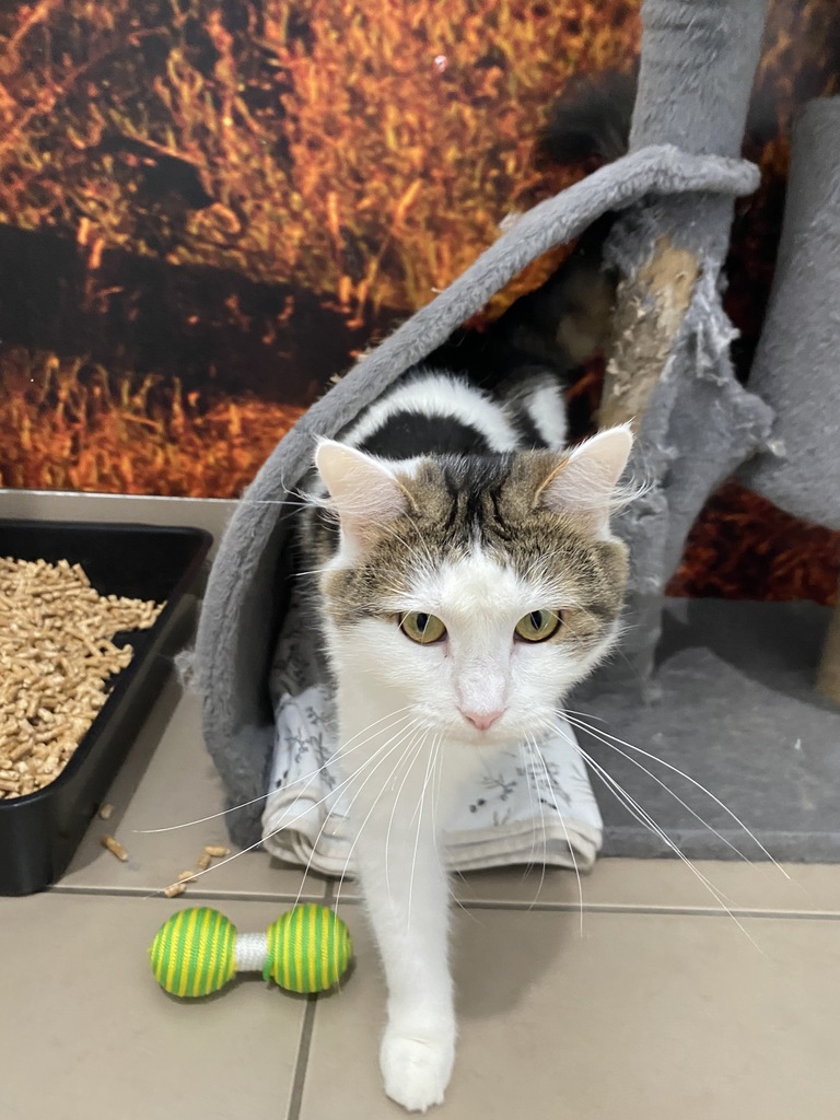 I'm only a small bean but my purr is big! I might be a bit shy at first, but give me a little time, and I'll show you my sweet side! I would love a quiet home where I can grow my confidence and truly show my personality. I am an affectionate girl, so I would love soft cuddles on your lap and curling up on the bed! My favorite spot is tucked under my cozy cat bed where I feel safe and warm!