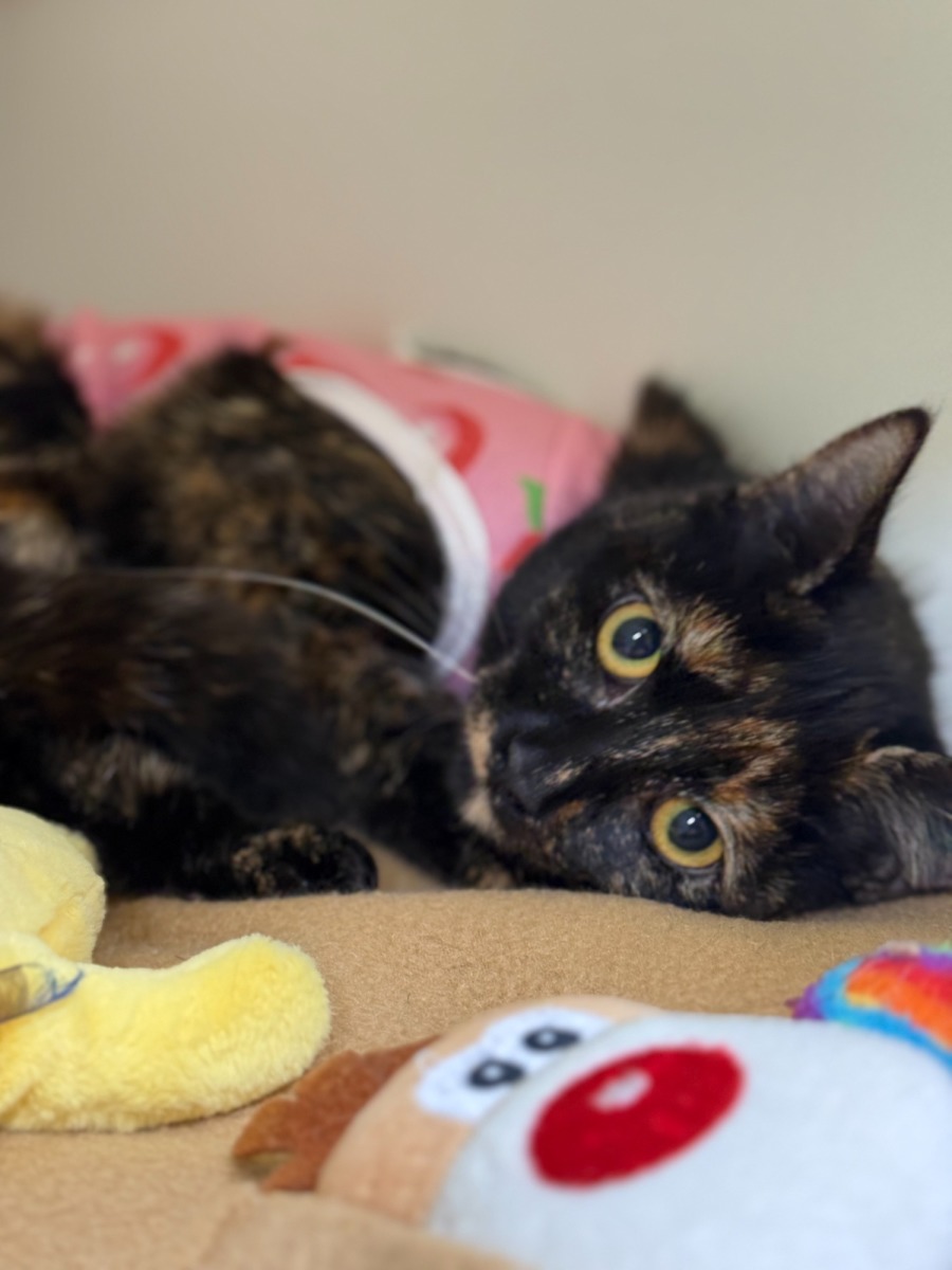 A cozy bed and a calm environment will help Dapple settle in and show her affectionate and curious side.