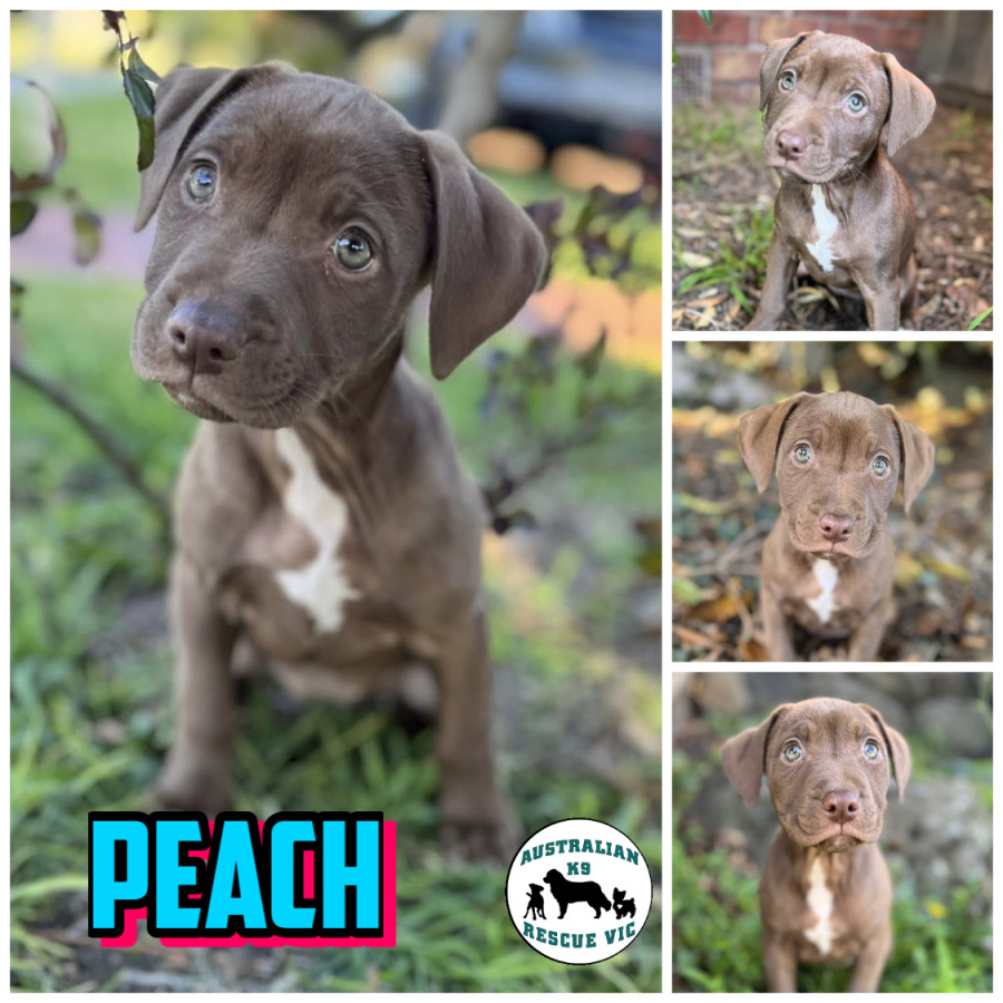 Peach came into rescue with her 8 little siblings after her owners had an accidental littler and her Mum is a med size staffy and her dad a med size Kelpie so we are pretty confident she will grow to a med size girl too at full growth,
