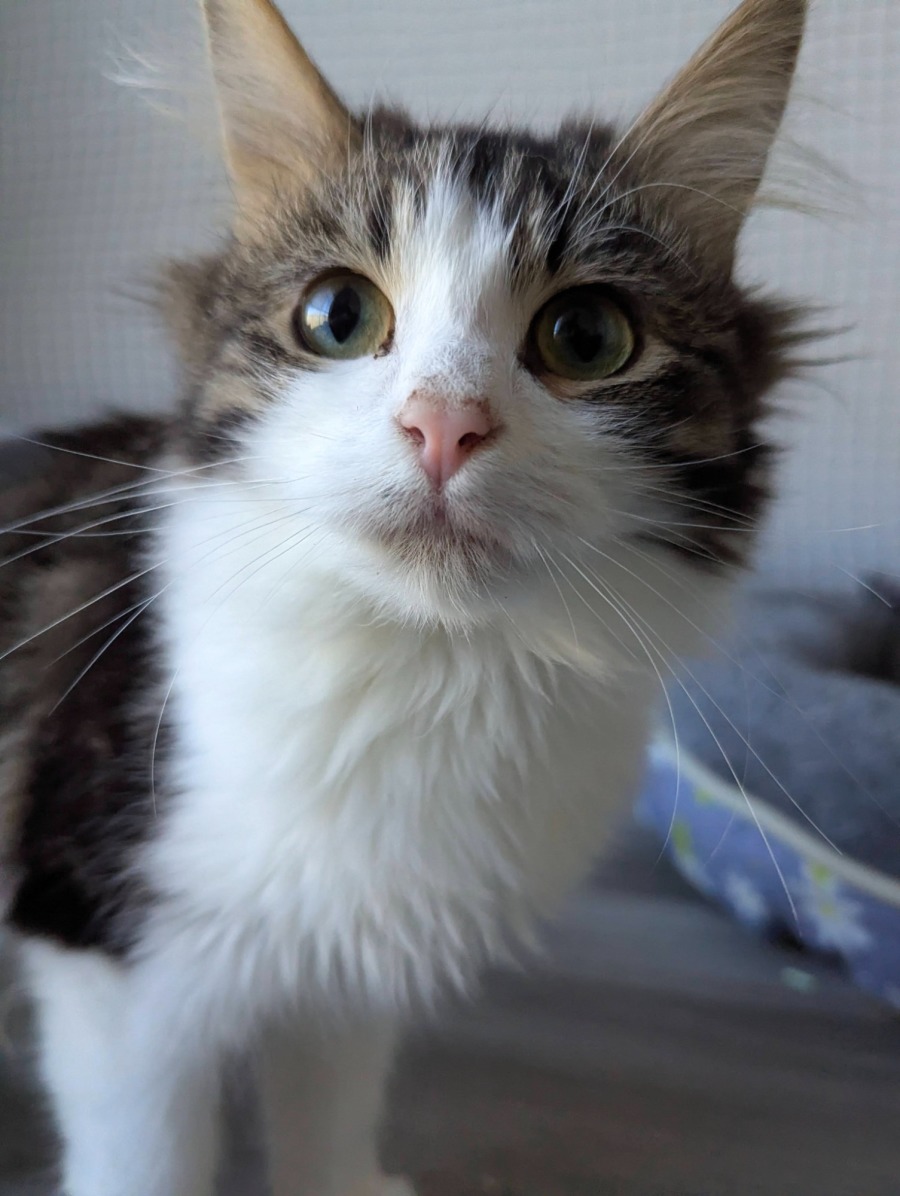 When introduced to a new environment and people, we have noticed that Maggie will revert back to her original temperament and becomes quite growly and can swat at other cats, but after settling down after a week or so, she goes right back to her loving temperament. She will need a family and a home that is willing to be patient with her and willing to work through her fears while she adjusts!
