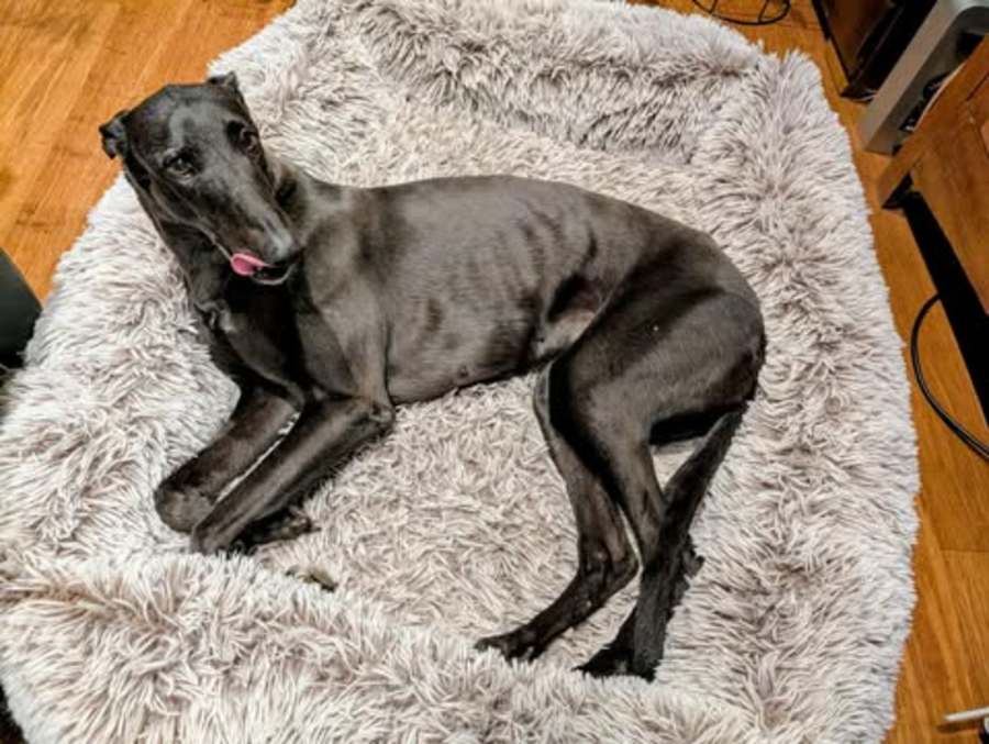 Lucy happily shares a bed with any of the other three grey girls. She has been quickly getting used to being left at home in greyhound company and so far has regularly been left a few hours without any issues.