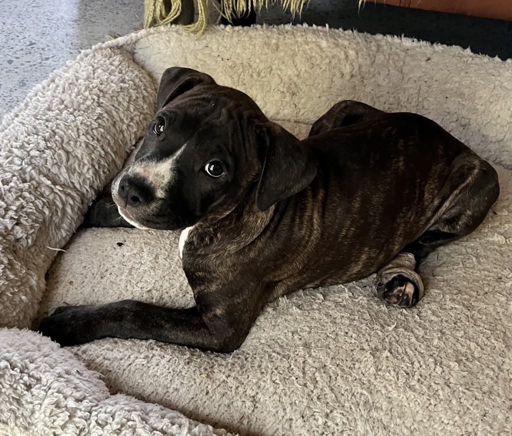 Meet Possum, a delightful female Staffordshire cross puppy with a heart full of love and a spirit brimming with playfulness! This charming girl has a warm and gentle nature, making her the perfect companion for families and individuals alike. Possum is already accustomed to living with small dogs, which shows her friendly demeanor and sociable personality. With her gorgeous, expressive eyes and wagging tail, she's ready to bond with her forever family and fill their home with joy and laughter.